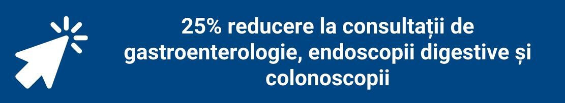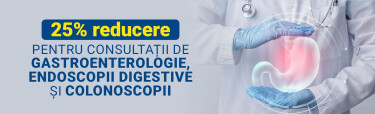 Ofertă supusă unor termene și condiții, valabilă în perioada 3 - 28 februarie 2026. Promoția nu se cumulează cu alte reduceri și este valabilă la Dr. Ilker Ablalim, Medic specialist Gastroenterologie, Dr. Carmen Lamatic, Medic primar Gastroenterologie, Dr. Oana Dolofan, Medic primar Gastroenterologie.