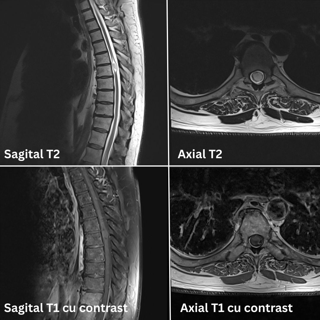 Examenul RMN 3 Tesla efectuat la Spitalul Clinic SANADOR a evidențiat o tumoră intramedulară localizată la nivel toracic (T6)