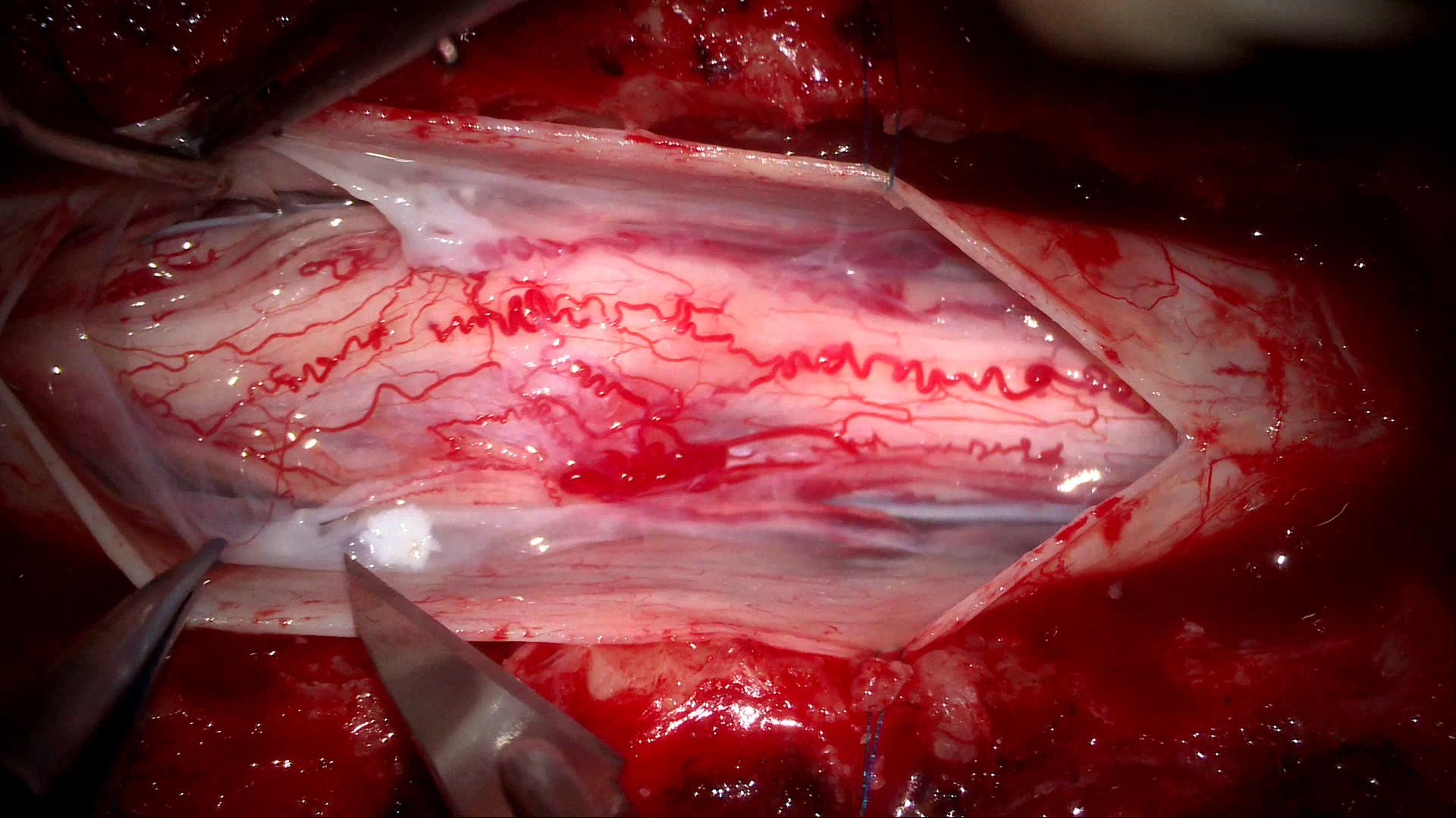 Intervenția neurochirurgicală a fost efectuată imediat după stabilirea diagnosticului, prin transferul pacientului intubat direct în blocul operator. Operația a presupus un abord precis al măduvei spinării, prin îndepărtarea controlată a unei porțiuni din vertebrele T5 și T6 (laminectomie) și deschiderea atentă a structurilor care protejează țesutul nervos.