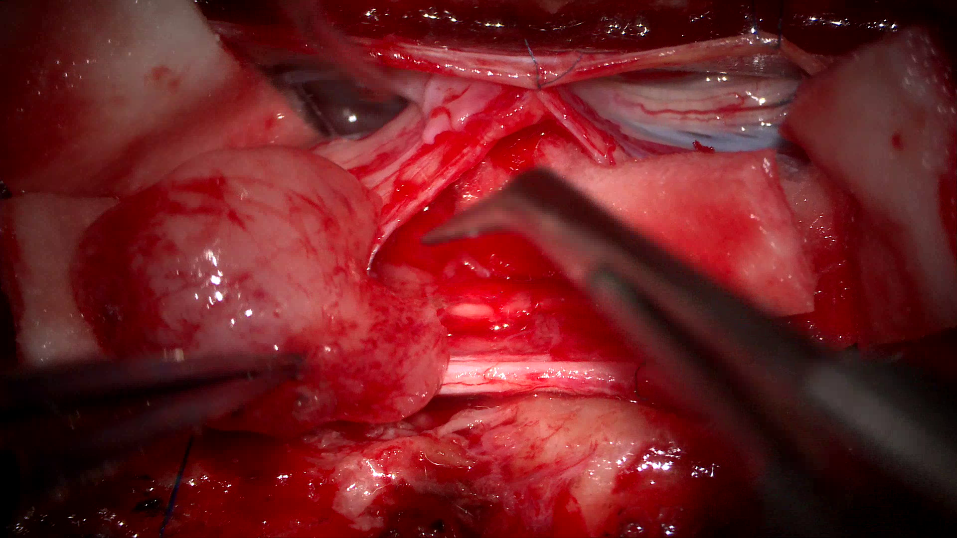 Dată fiind poziția excentrică a tumorii, echipa chirurgicală a fost nevoită să utilizeze o tehnică specială de abord, o mielotomie laterală, care a permis disecția circumferențială și îndepărtarea completă a formațiunii tumorale, fără lezarea țesutului medular. Tumora a fost excizată integral, într-o singură piesă.