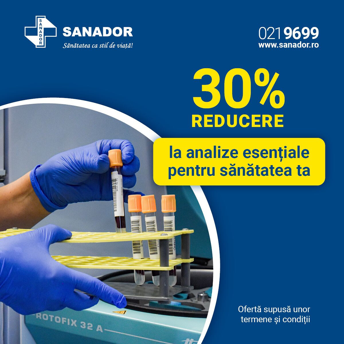 SANADOR încurajează grija față de sănătate, oferind pachete de analize medicale cu 30% reducere, pentru ca dumneavoastră să puteți preveni și depista din timp afecțiunile care vă pot influența starea de bine.