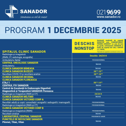 În data de 1 decembrie 2025, clinicile și punctele de recoltare SANADOR vor funcționa după un program special.