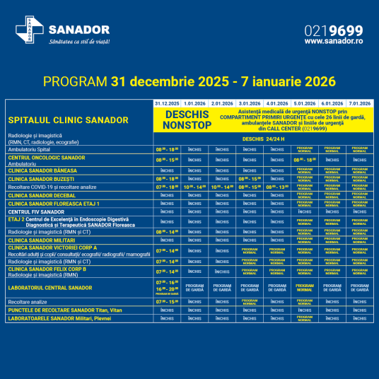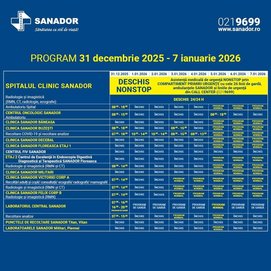 În perioada 31 decembrie 2025 - 7 ianuarie 2026, clinicile și punctele de recoltare SANADOR vor funcționa după un program special.