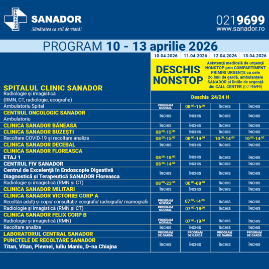 În perioada 10-13 aprilie 2026, clinicile și punctele de recoltare SANADOR vor funcționa după un program special.
