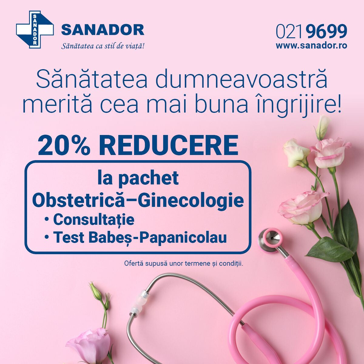 *Oferta este valabilă în perioada 01 - 31 decembrie 2025 în Clinica SANADOR Militari și se aplică exclusiv pentru consultațiile de obstetrică-ginecologie + test Babeș-Papanicolau efectuate la: Dr. Elena - Lorena Cojocaru, Medic specialist Obstetrică-ginecologie și Dr. Ioana Zechiu, Medic specialist Obstetrică-ginecologie . Oferta nu se cumulează cu alte promoții în curs.