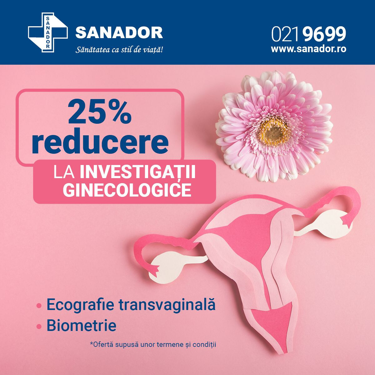 Până la 31 martie 2026, la Clinica SANADOR Militari, vă oferim 25% reducere la investigații ginecologice*, realizate de medici specialiști cu ajutorul echipamentelor moderne.
