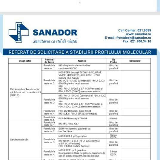 La SANADOR, punem pacienții în centrul îngrijirilor medicale și asigurăm managementul integrat al cancerului, pe baza celor mai noi abordări diagnostice și terapeutice. Prin colaborarea strânsă în echipa oncologică multidisciplinară, dintre specialiștii în oncologie medicală, radioterapie, chirurgie oncologică, anatomie patologică și radiologie-imagistică medicală, asigurăm fiecărui pacient o strategie personalizată de tratament, adaptată nevoilor sale specifice. SANADOR oferă testări genetice pentru cancer de sân prin Programul Național de Oncologie, facilitând accesul gratuit la aceste investigații.