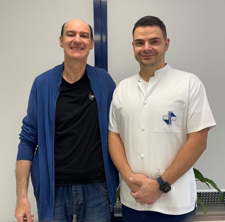 Octavian, alături de Dr. Bogdan Steriade, la Clinica de Stomatologie SANADOR, mulțumit de noua sa dantură.