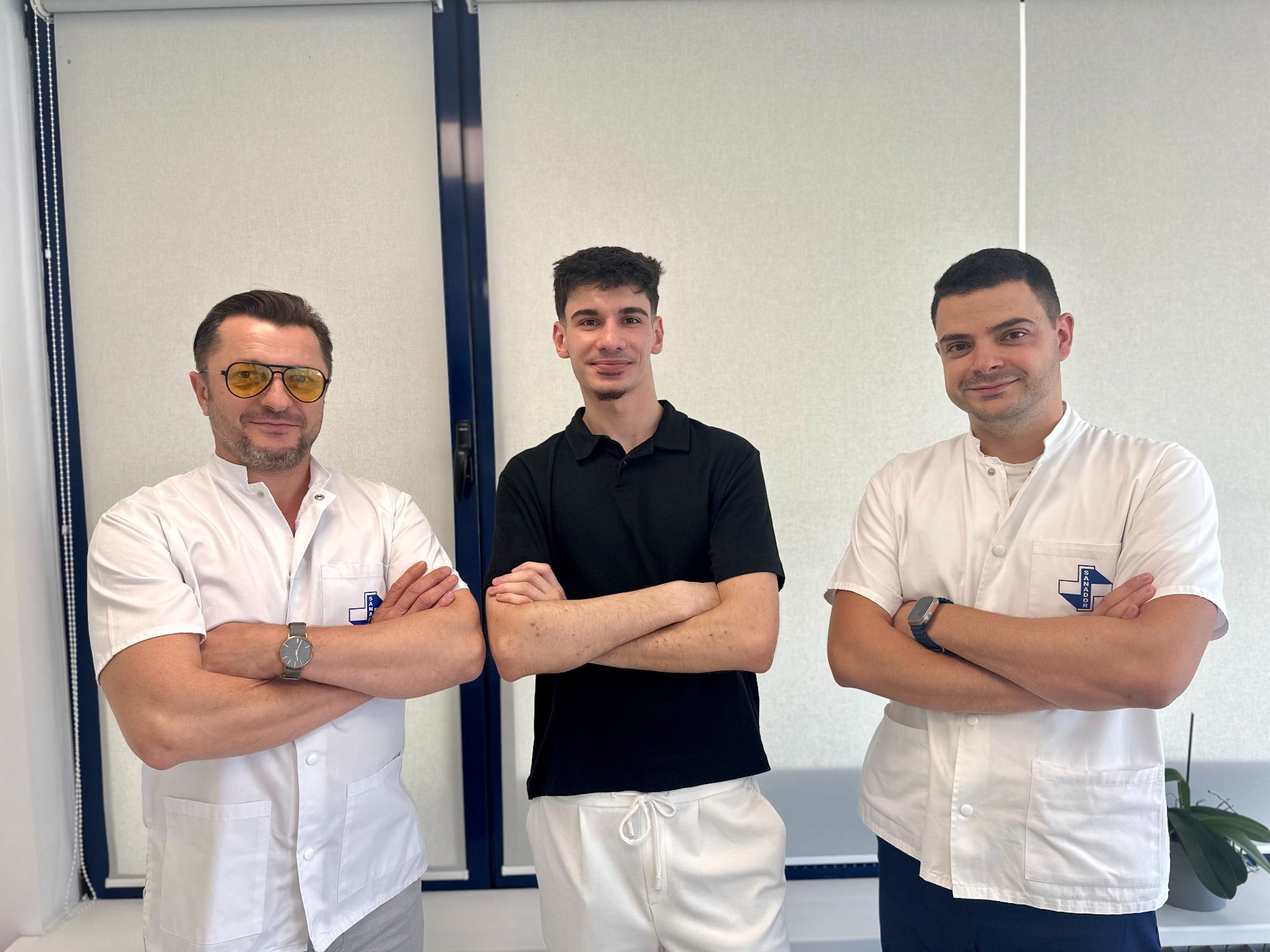 Andrei, după finalizarea tratamentului, împreună cu Dr. Adrian Dima și Dr. Bogdan-Nicolae Steriade, la Spitalul Clinic SANADOR.